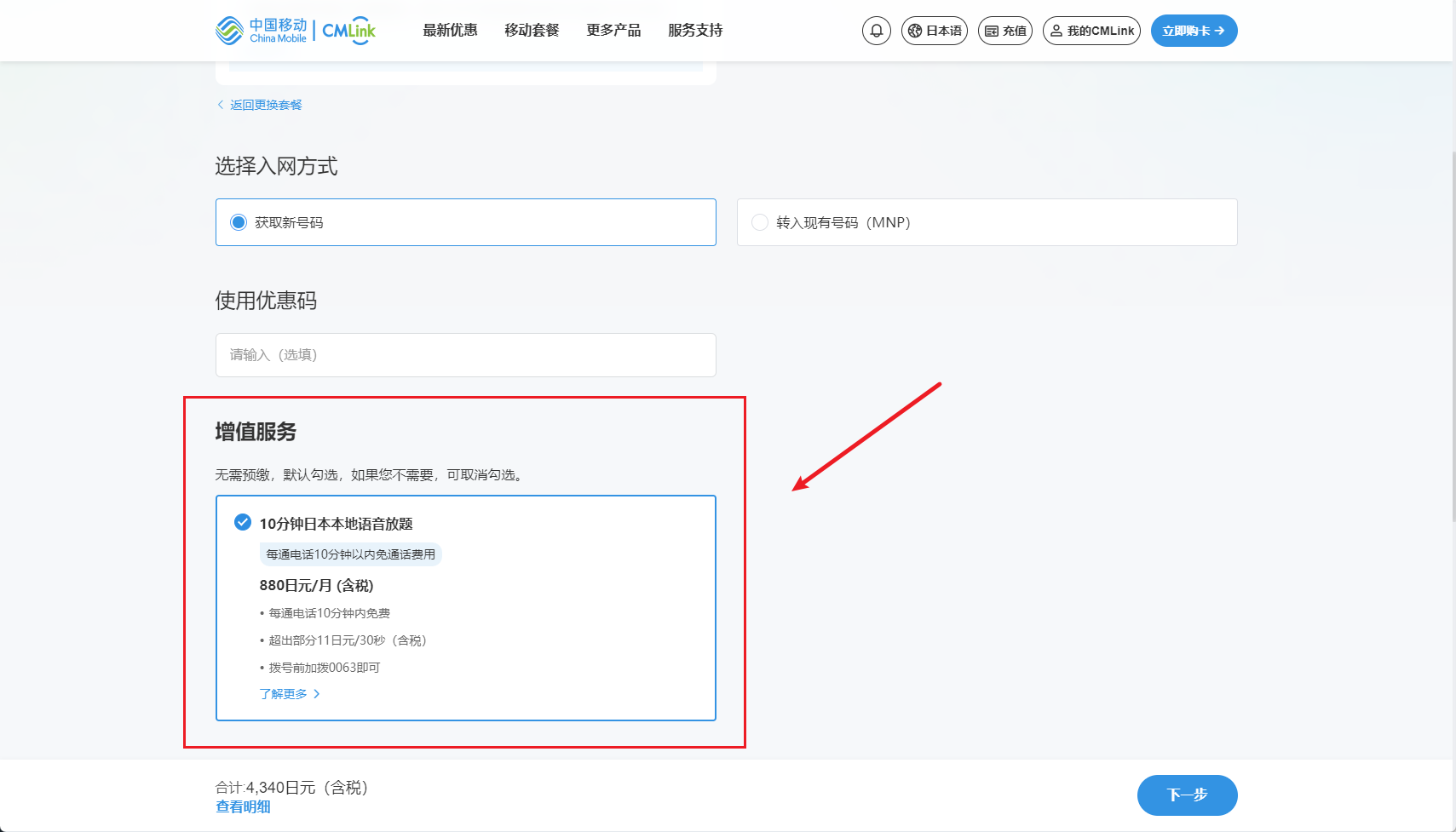 增值服务处默认勾选的 10分钟日本本地语音放题 是可以取消的