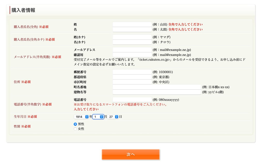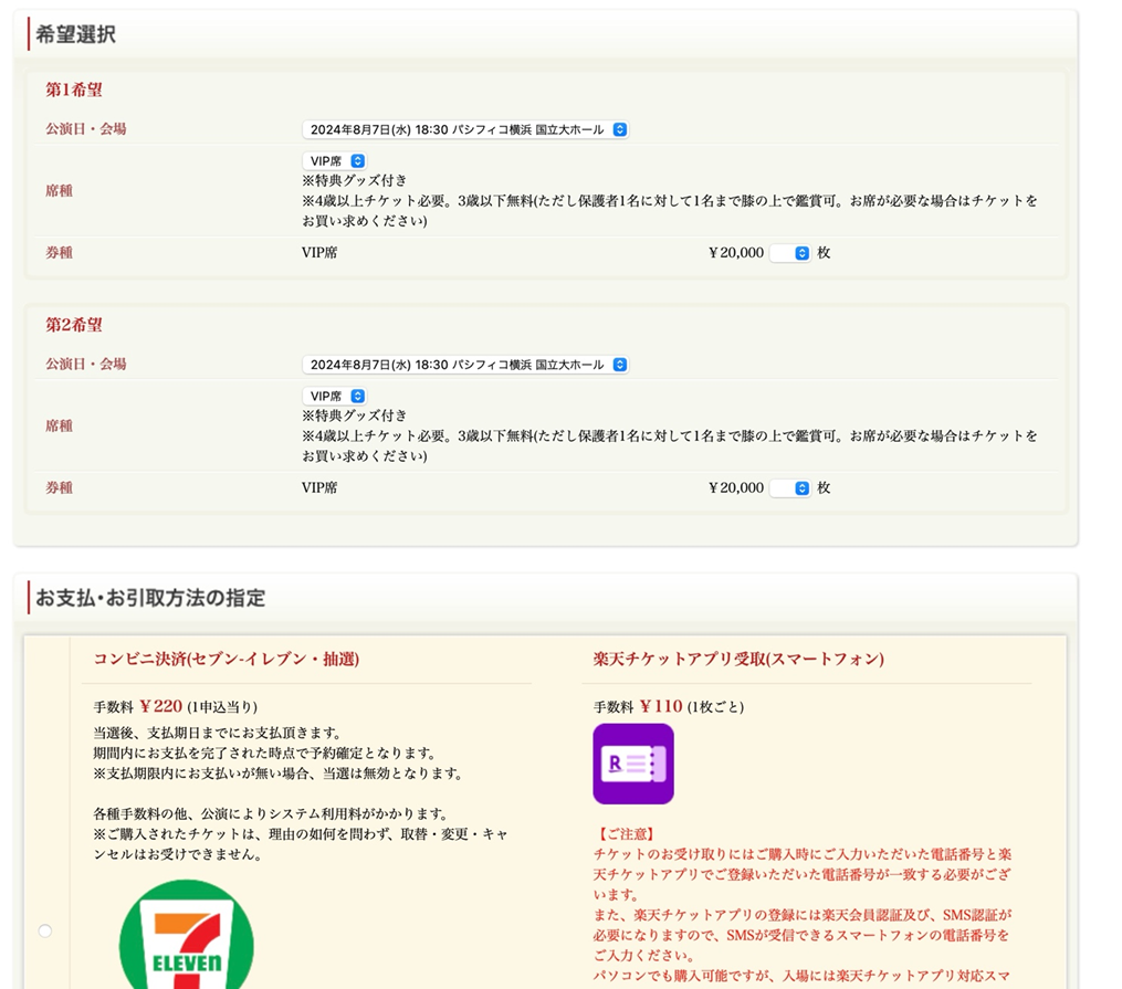 在此页面中,需要注意的是引取方法没有办法选择,只能是「楽天チケットアプリ受取」,支付方法通常选择「コンビニ」,这样的付款方式可以使你不必要在抽选环节付费,而是在抽选已经确认后再行付款。